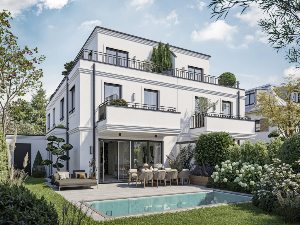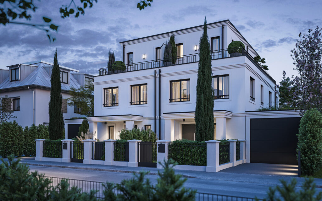 Die Architektur der beiden Villenhälften setzt auf klassische Gestaltungsprinzipien mit moderner Klarheit. Fassadenstrukturen mit Tiefe, sorgfältig ausgearbeitete Gliederungen und großzügige Fensterflächen verleihen den Häusern eine repräsentative und zugleich harmonische Wirkung.