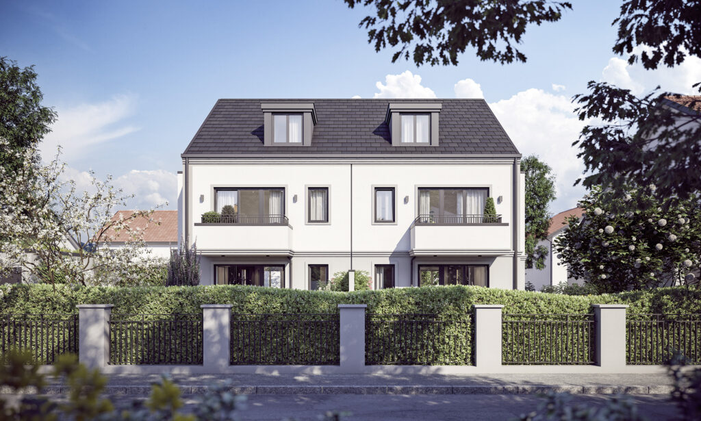 Es entstehen zwei neue Villenhälften, die modernes Wohnen, klare Architektur und großzügige Grundstücke in einem gewachsenen Wohnumfeld vereinen.