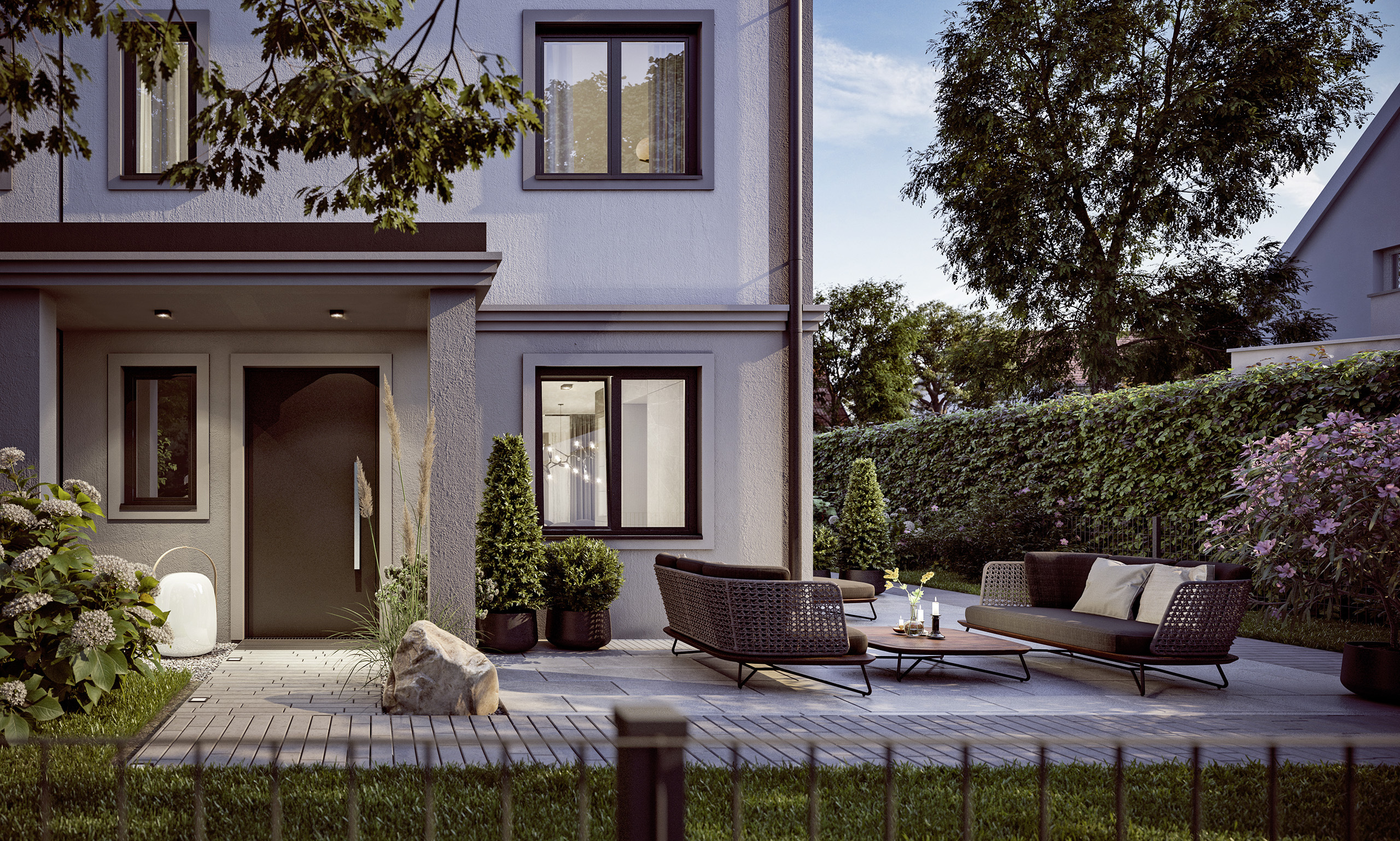 Jede Villenhälfte verfügt über zwei Terrassen sowie einen grünen Gartenbereich, der vielfältige Nutzungsmöglichkeiten bietet.