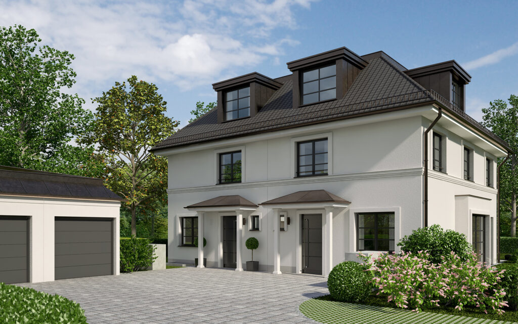 Die Doppelhaushälften orientieren sich an einem klassischen Villenstil und überzeugen durch eine elegante, zeitlose Gestaltung. Traditionelle Elemente werden mit moderner Bauqualität kombiniert und schaffen ein harmonisches Gesamtbild. Erker und sorgfältig ausgearbeitete Fassadengliederungen verleihen den Gebäuden Struktur und Charakter. Großzügige Gauben, Sprossenfenster und gemauerte Balkonbrüstungen unterstreichen den hochwertigen Anspruch. Repräsentative Eingangsbereiche sowie eine fein abgestimmte Farbgestaltung sorgen für eine architektonische Ausstrahlung, die Wertigkeit, Stil und Beständigkeit vermittelt.