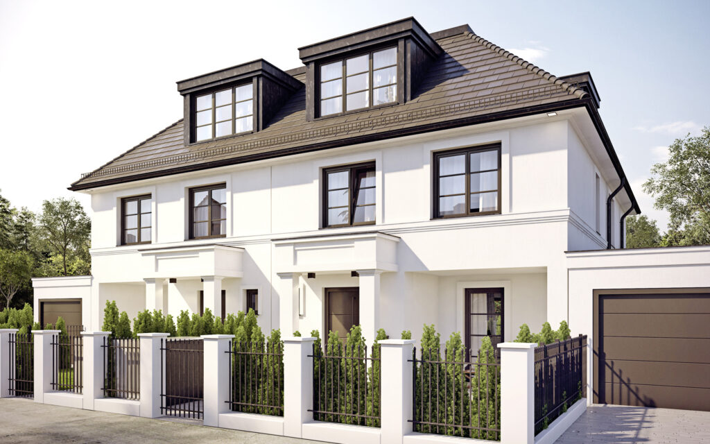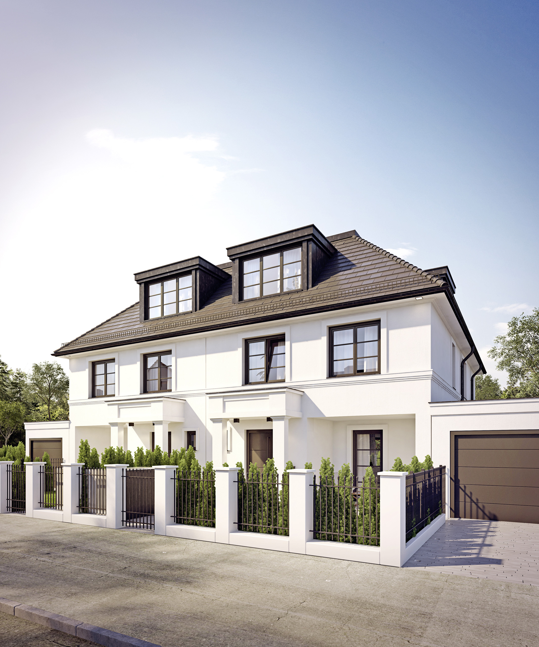 Die architektonische Gestaltung setzt auf klassische Eleganz und eine ausgewogene Fassadengliederung. Erker und großzügige Gauben verleihen den Baukörpern Plastizität, während fein ausgearbeitete Faschen und dezente Schmuckelemente die Wertigkeit unterstreichen.