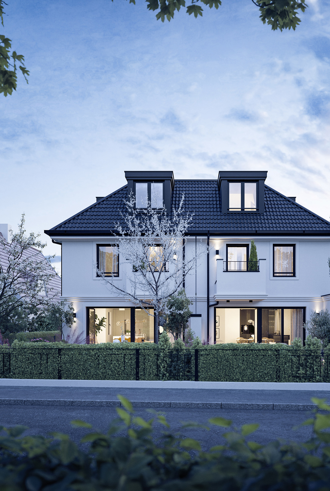 Zeitlos mit liebevollen Details: Die Villenhälften setzen auf traditionelle Ästhetik und stilsichere Individualität. Das unterstreichen unter anderem Erker und Gauben, große Fensterflächen mit Faschenumrandungen, elegante Bossenstrukturen, großzügige Entrées und die geschmackvolle Farbgestaltung.