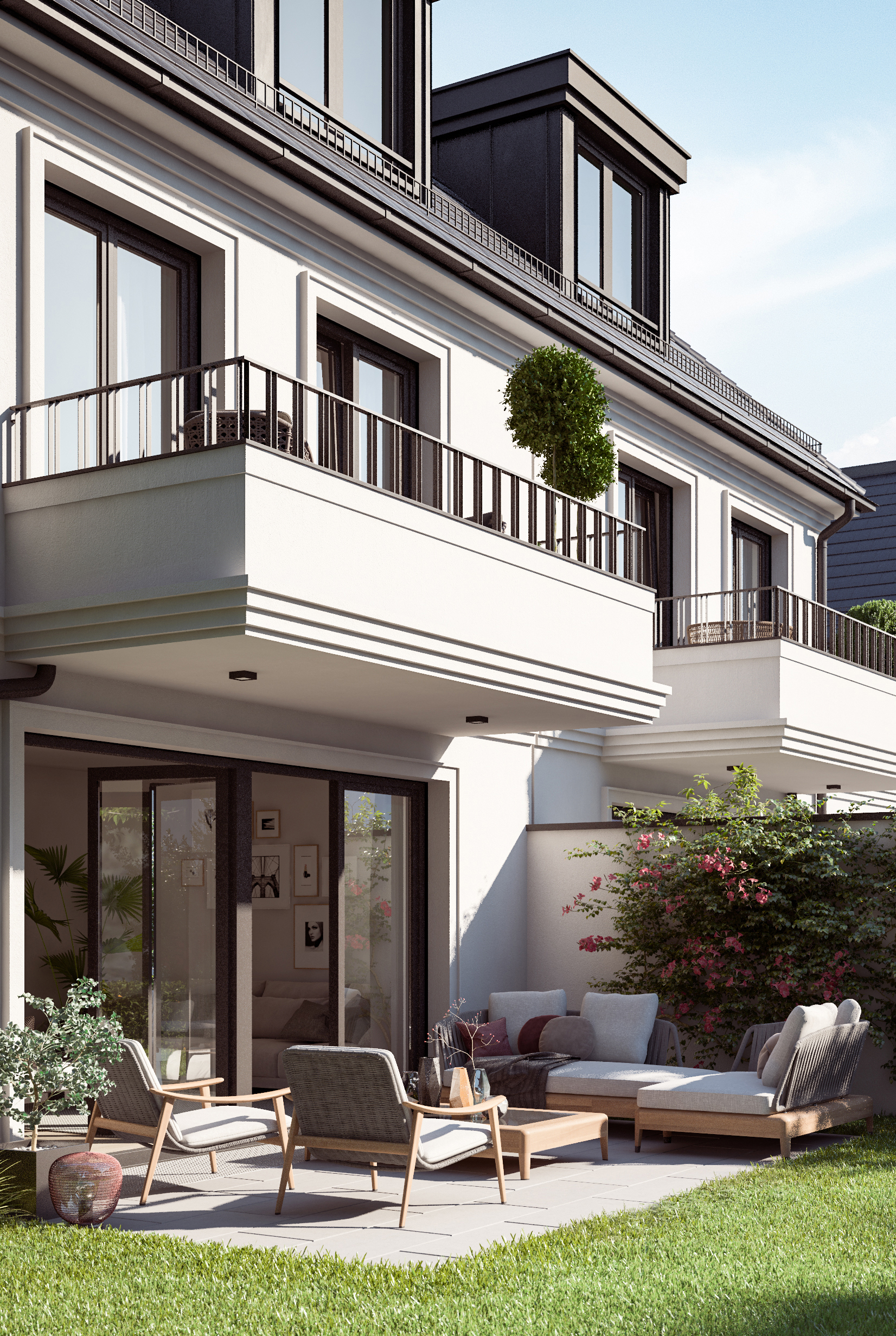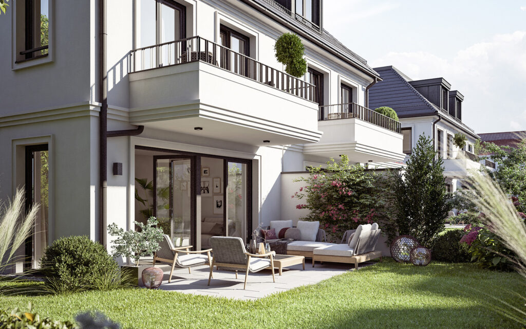 Die Architektur orientiert sich an klassischen Proportionen und setzt diese in einer modernen, klaren Formensprache um. Feine Fassadendetails, strukturierte Gliederungen und große Fensterflächen verleihen den Häusern eine elegante und wertige Erscheinung. Im Inneren überzeugt jede Villenhälfte durch einen offenen Wohnbereich, fließende Raumübergänge und einen privaten Masterbereich im Dachgeschoss. Hochwertige Materialien, sorgfältige Planung und eine ausgewogene Lichtführung schaffen ein Wohnambiente mit Charakter.